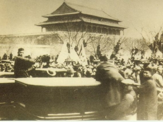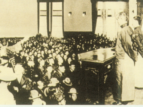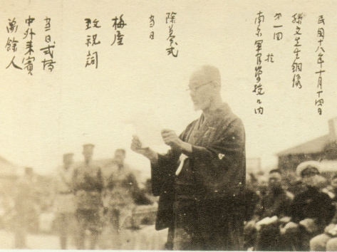 1929年10月14日,梅屋莊吉在南京軍官學校舉行的第一尊孫中山銅像揭幕典禮上致詞照片