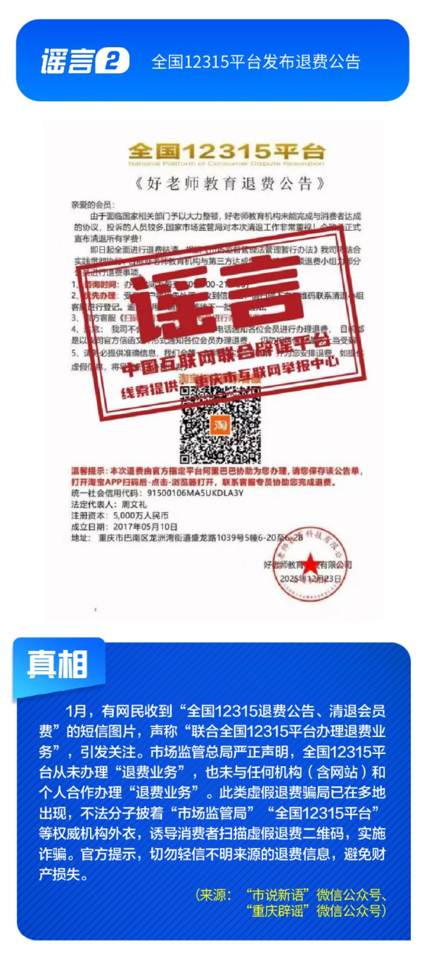 公共政策領(lǐng)域謠言誤導(dǎo)公眾決策?!吧绫?]有有效期限制、未到期不能換新卡”是對社??ü芾碚叩恼`讀,給民眾平添困擾;“28家博物館元旦期間閉館”實為少數(shù)博物館根據(jù)運營安排所做的微調(diào),網(wǎng)帖嚴(yán)重夸大實際閉館情況,引發(fā)負(fù)面炒作;“深圳有望推行12年義務(wù)教育,高中免費”是對現(xiàn)行政策的“超前編造”,誤導(dǎo)學(xué)生及家長群體;“全國12315平臺發(fā)布退費公告”,則是假冒監(jiān)管機(jī)構(gòu)名義散播不實通知,為后續(xù)詐騙行為做鋪墊。