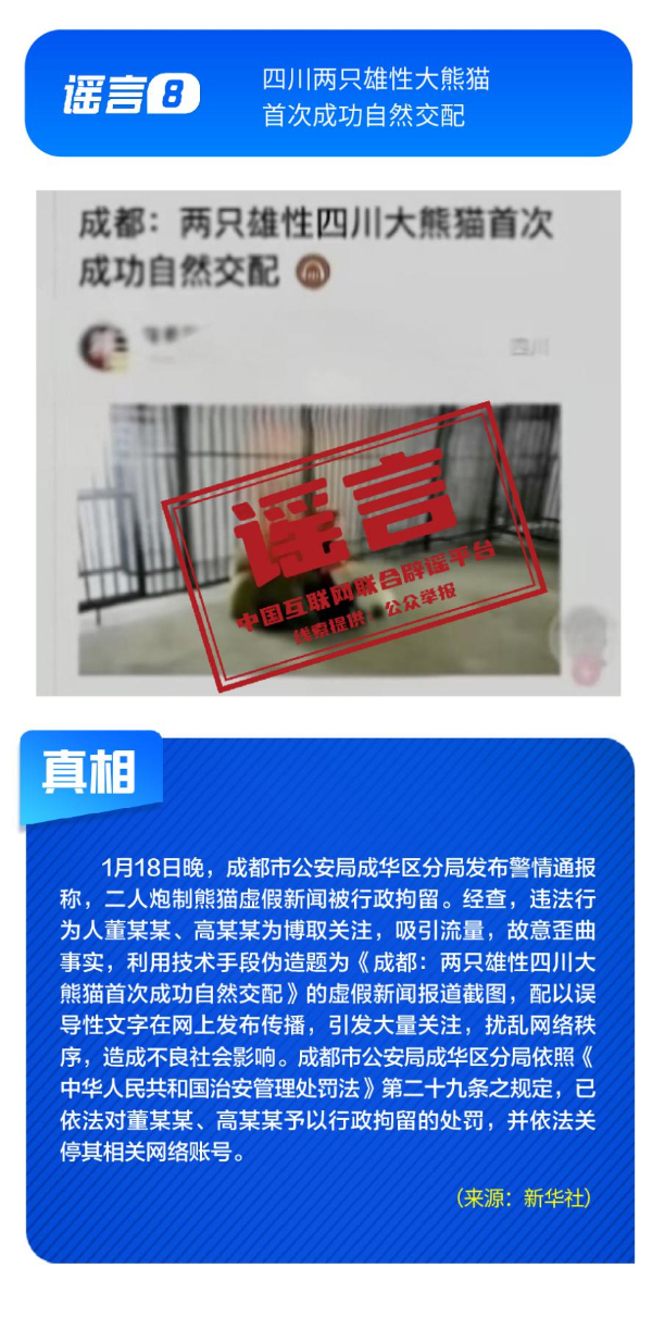 針對各類網(wǎng)絡(luò)謠言與亂象,多部門開展協(xié)同治理,聯(lián)動整治。1月16日,中央網(wǎng)信辦召開全國網(wǎng)絡(luò)辟謠聯(lián)動機(jī)制第三次全體會議,部署以辟謠工作新成效助力清朗網(wǎng)絡(luò)空間建設(shè)。中央網(wǎng)信辦聯(lián)合工業(yè)和信息化部等部門持續(xù)整治汽車行業(yè)網(wǎng)絡(luò)亂象,處置一批涉嫌挑動對立、炒作負(fù)面話題、違規(guī)測評的賬號;國家廣播電視總局開展“AI魔改”視頻專項治理,各平臺處置大量違規(guī)內(nèi)容。各地網(wǎng)信部門積極行動,陜西西安深入開展房地產(chǎn)領(lǐng)域網(wǎng)絡(luò)專項行動,處置散布樓市謠言的房產(chǎn)中介賬號,四川成都依法處置30余個惡意關(guān)聯(lián)地域、污名化城市的違規(guī)賬號。公安機(jī)關(guān)依法打擊造謠傳謠人員。擺拍“小女孩在學(xué)校跳蚤市場用50元淘到名酒”、利用AI偽造“假救護(hù)車非法轉(zhuǎn)運”、編造“兩只雄性四川大熊貓首次成功自然交配”等謠言的相關(guān)責(zé)任人已依法被予以行政處罰。